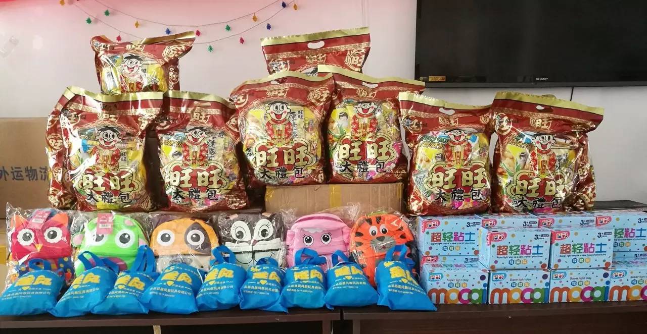 孩子們背著小書包、吃著旺旺食品、看著做好的玩具,小臉上滿滿的幸福!?。《覀円灿X得很快樂、很滿足、很幸福!